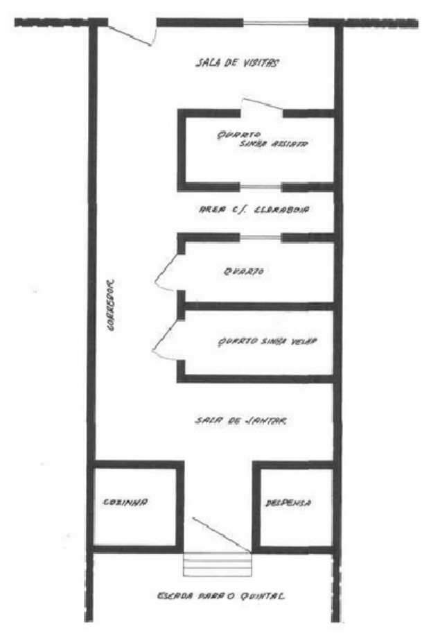 Depois de uma sala de visitas ampla, que nos dias de festa era reservada para o baile, a casa se encompridava para o fundo, num corredor escuro onde se enfileiravam três quartos intervalados por uma pequena área que deixava entrar luz através de uma claraboia. No final, uma sala de refeições, a cozinha, grande, e a despensa. Atrás da casa, um quintal com um centro de terra batida para se dançar e depois um barracão de madeira onde ficavam ritualmente dispostas as coisas do culto.